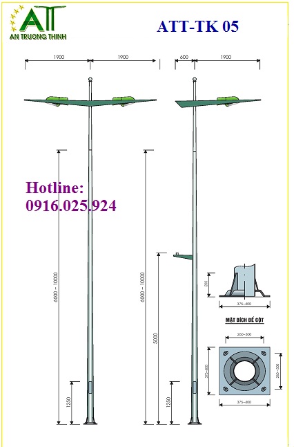 - Trụ đèn chiếu sáng có chiều cao 10m dày 4mm, thông số đường kính phi 60/190, Đế 400x400x12mm.