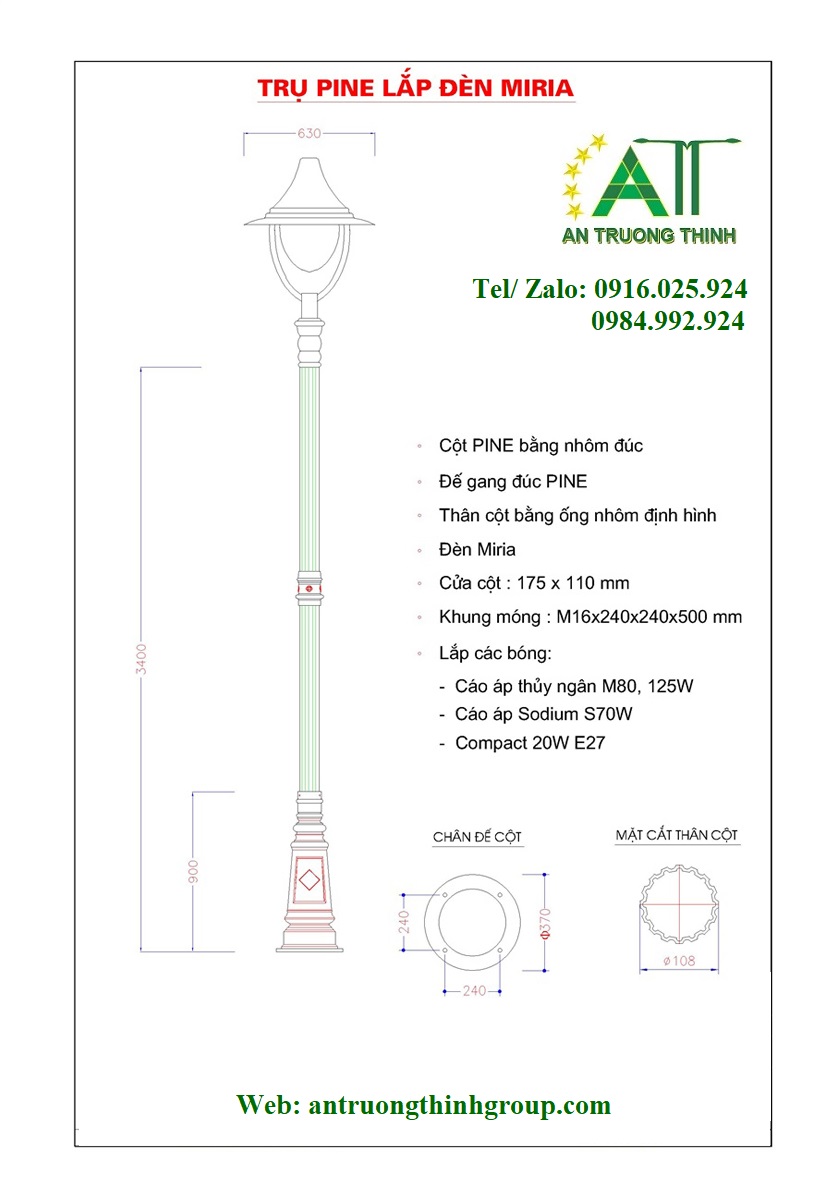 Cột Đèn Công Viên Đế Gang PINE Lắp Đèn Miria