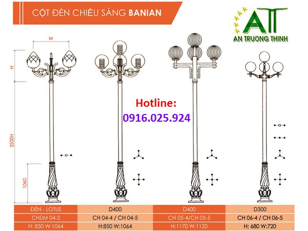 Cột Đèn Sân Vườn Đế Banian Lắp Đèn Cầu Hoa Sen