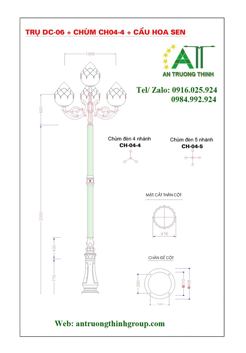 An Trường Thịnh - Cột Sân Vườn Đế Nhôm DC06 Lắp Đèn Hoa Sen
