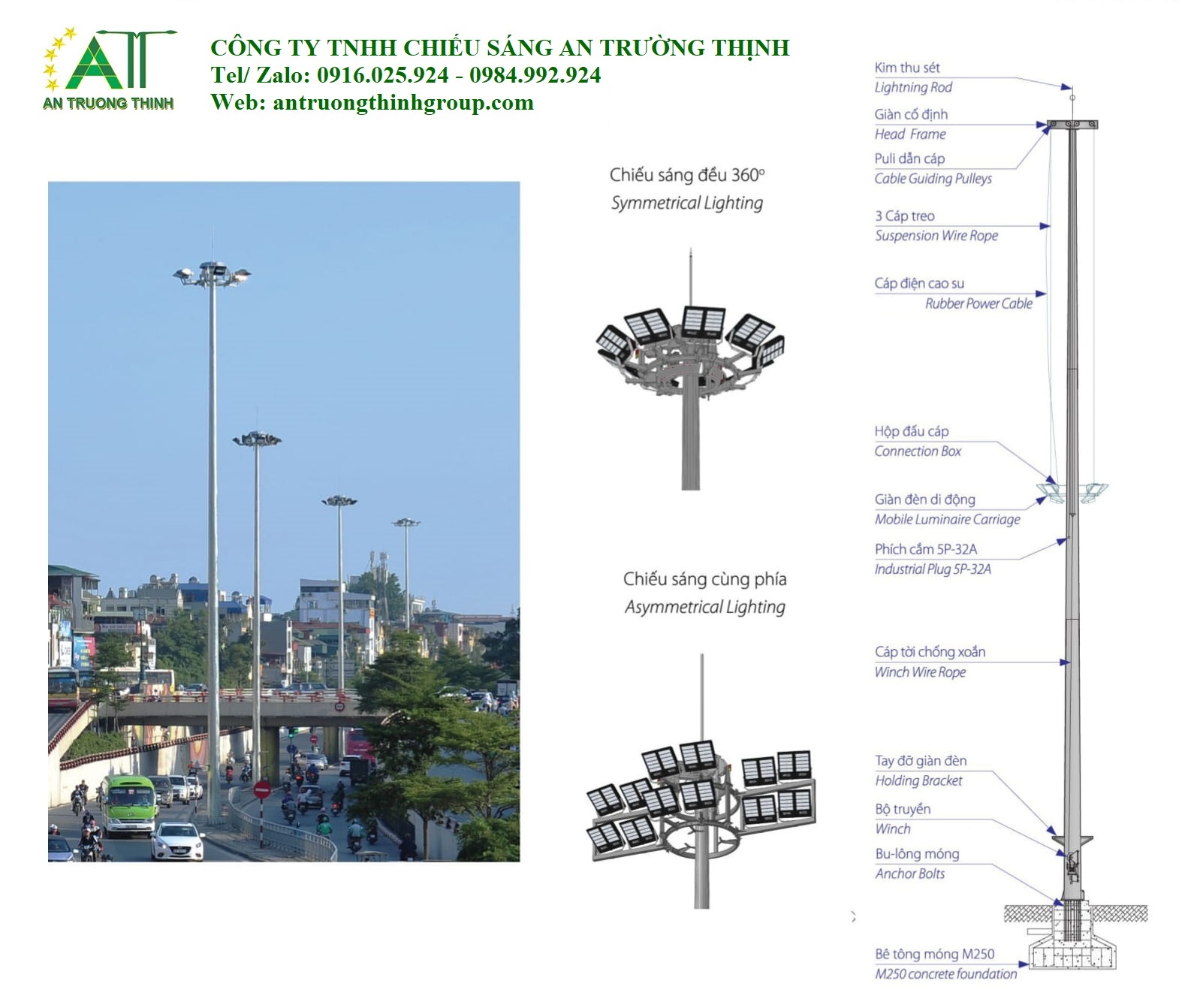 Trụ Đèn Chiếu Sáng Đa Giác Giàn Nâng Hạ 17m, 20m, 25m, 30m
